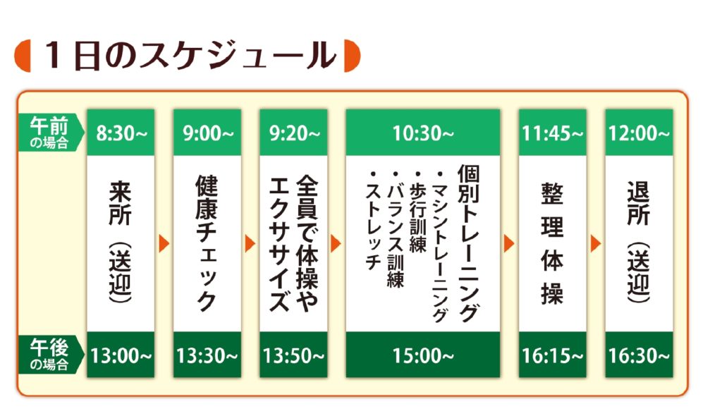 食事や入浴はありませんが、「もっと体を動かしたい」「しっかり歩けるようになりたい」という方には最適です。